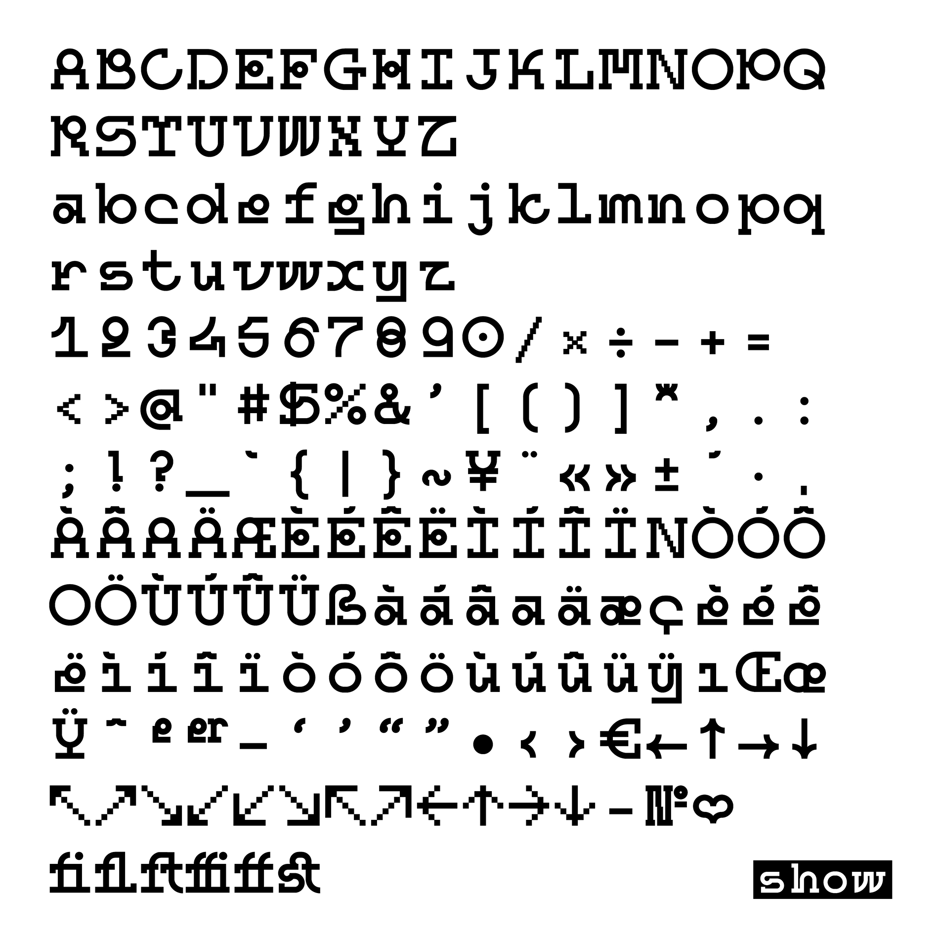 Deux fontes à chasse fixe sont dessinées pour ce projet : la Show et la Case. La première s’exprime par le détour et l’arrondi tandis que le dessin de la deuxième est dépourvu de courbe. L’idée est d’amener l’observateur à percevoir, à la première seconde où se porte son regard, un gris typographique inhabituel et pouvant être interprété comme des signes ou une langue étrangère. 5OU6ÎLES n’a pas vraiment de logo, il est simplement surligné et les éléments de communication (cartes, dépliants et affiche) sont encadrés d’un diptyque vertical qui, le cas échéant, s’écarte pour faire de la place au texte dans des formats carrés ou domino imprimés en noir et blanc et en petite série.
